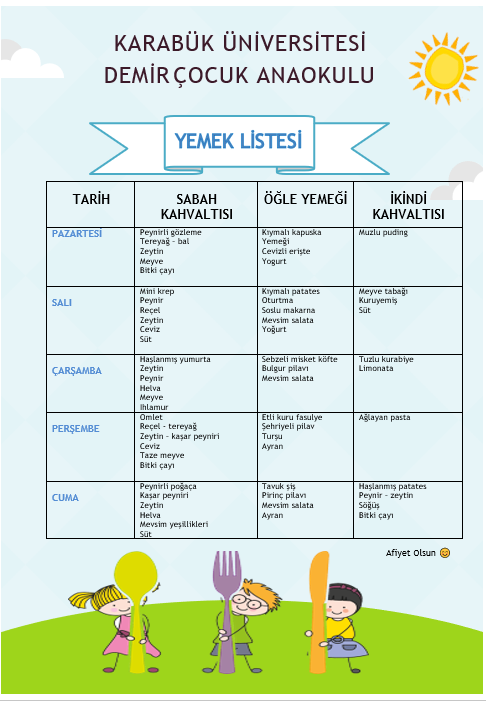 KARABÜK ÜNİVERSİTESİ DEMİR ÇOCUK ANAOKULU 22.12.2025 - 26.12.2025 YEMEK LİSTESİ