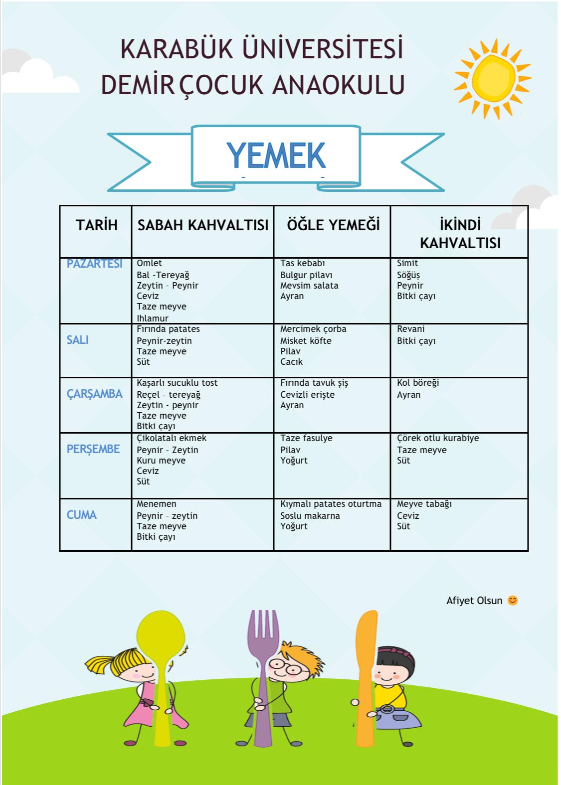 KARABÜK ÜNİVERSİTESİ DEMİR ÇOCUK ANAOKULU 29.09.2025 - 03.10.2025 YEMEK LİSTESİ
