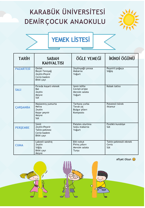 KARABÜK ÜNİVERSİTESİ DEMİR ÇOCUK ANAOKULU 09.03.2026 - 13.03.2026 YEMEK LİSTESİ